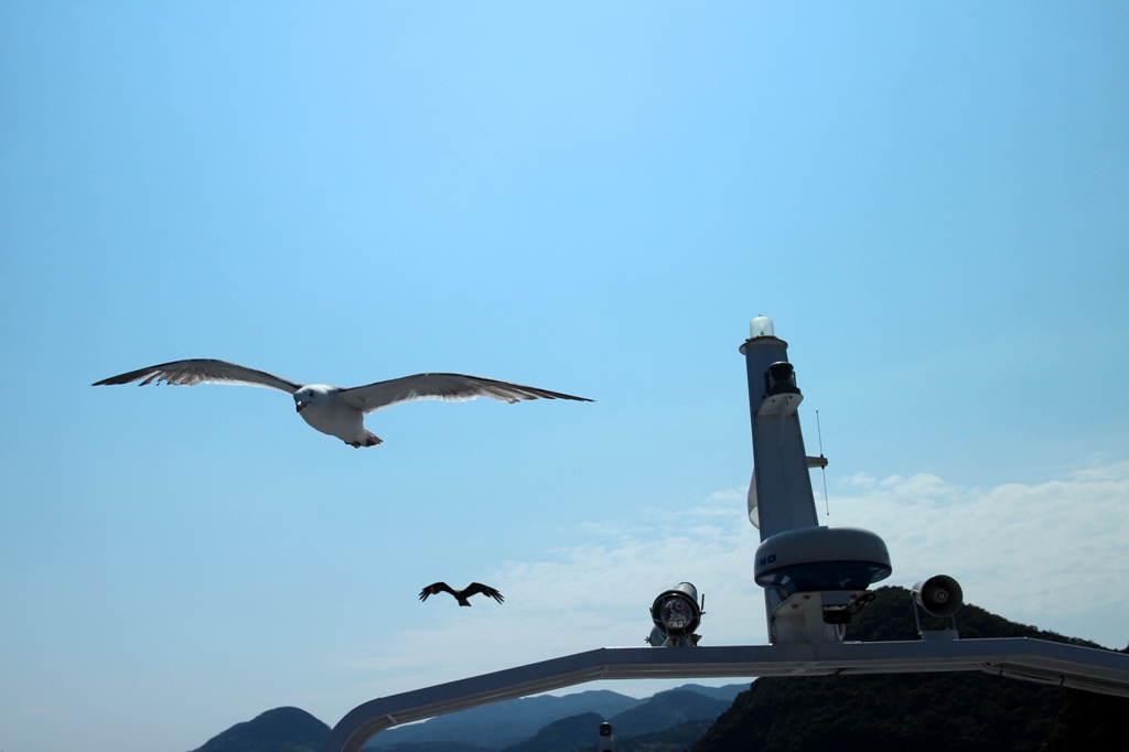 船上ではかっぱえびせんがカモメにふるまわれ、