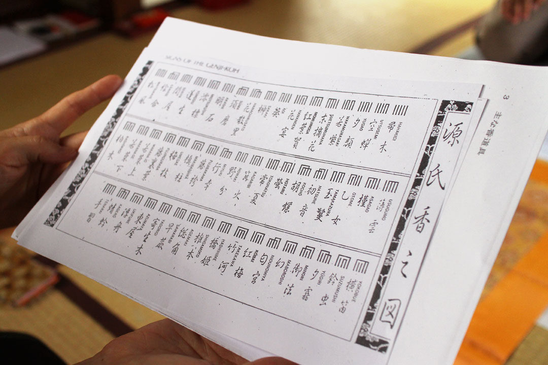 ちなみに「源氏香」とは、先生がその日味わう香木を5種類、5包づつ、25包用意し、無作為に5包選び、一つずつ聞香炉でたき香りを聞いては記憶にとどめ、回していきます。
