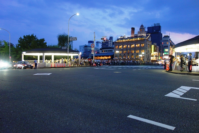日の暮れたころ、四条大橋の交差点、全面通行止め・・・