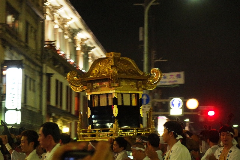 汲んである鴨川の水をぱしゃーってかけて、お御輿をお清めするというのが神輿洗式。