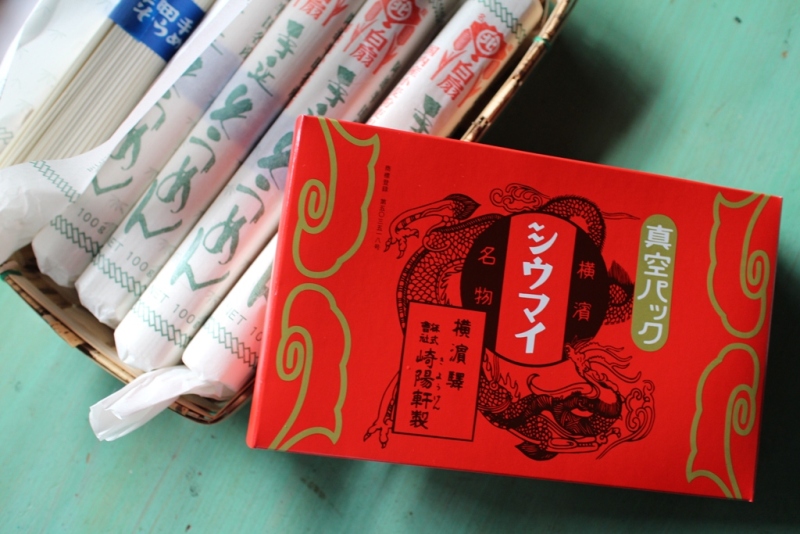 シウマイのおともは、レトロな包み紙の半田手延べ素麵。