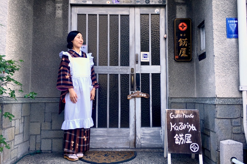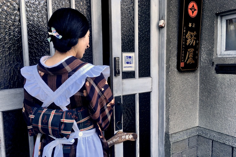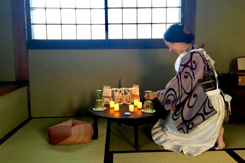 ツインルームのちゃぶ台の上のセッティングをするあゆみさん。