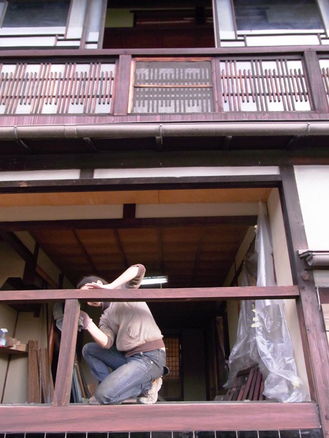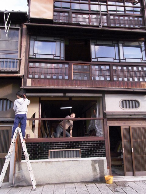 こちらは建具をはずして菜種油を塗っている、オーナー和楽庵女将と、楽座女将のつるちゃん!