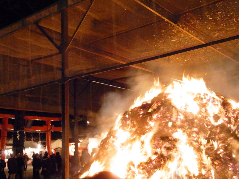 各家庭より持ちよられた、お正月飾り等でできた山を一気に焼きます。