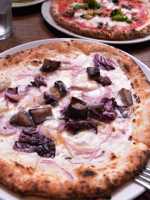 写真のピザは秋ナスとアンチョビとモツァレラチーズの、クリームソースのピザ。色もシブいでしょ!