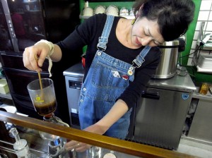 クラシックなサイフォンで、コーヒーを入れてくれる金魚家女将。
