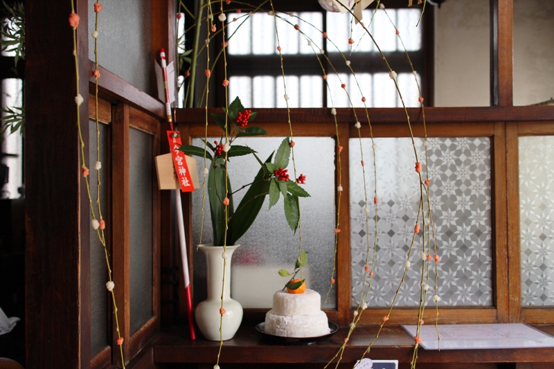 フロントもお正月仕様で、いつもの千両、餅花、鏡餅です。